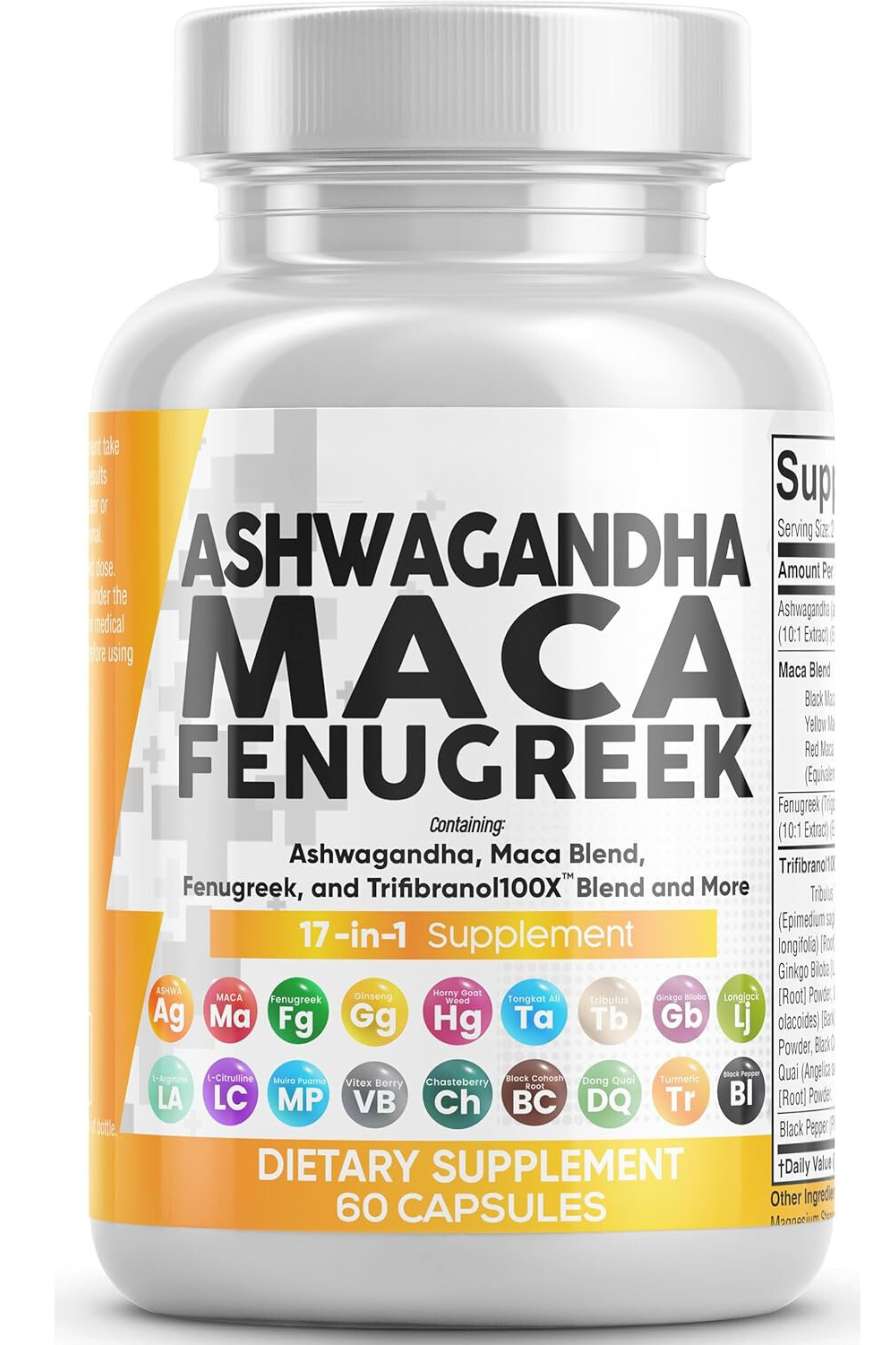 Ashwagandha 5000mg Maca Root 2000mg Fenugreek 3000mg Supplement with Tongkat Ali Ginseng - Assists with Stress, Mood & Thyroid Health - Ashwagandha Capsules Maca Pills Fenugreek Caps - 60 Count